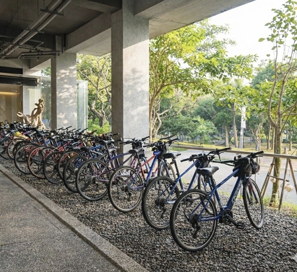 The hotel provides an outdoor parking area (locking required) and simple cleaning and rinsing facilities.