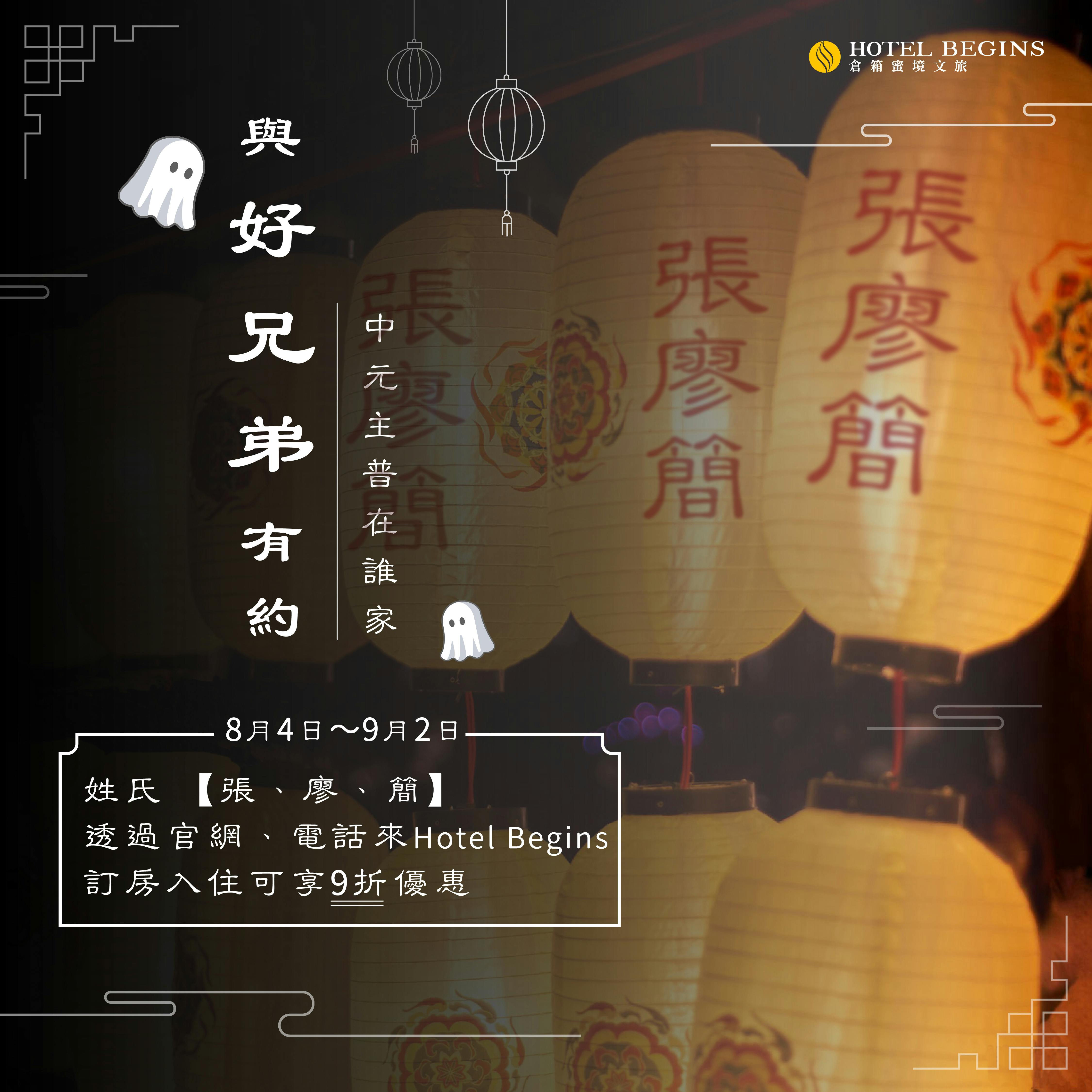 Promotion period: 8/4 - 9/2. Book any room package on our official website and present your ID at the front desk on the day of check-in. If your last name is Zhang, Liao, or Jian, you will receive a 10% discount.