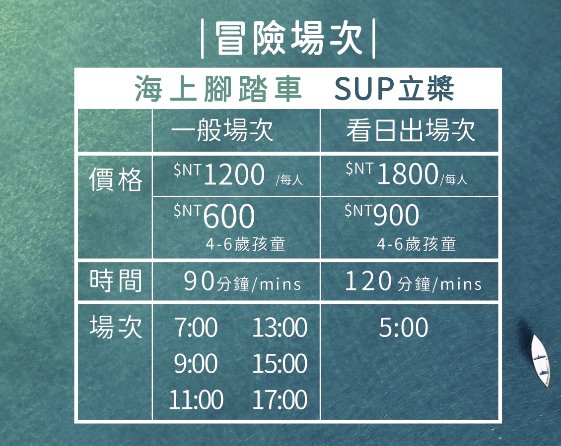 (1)依房型人數附贈水上腳踏車(二人一車)或SUP立槳(一人一板),附贈之水上活動適用成人,若由兒童替代不額外退費。