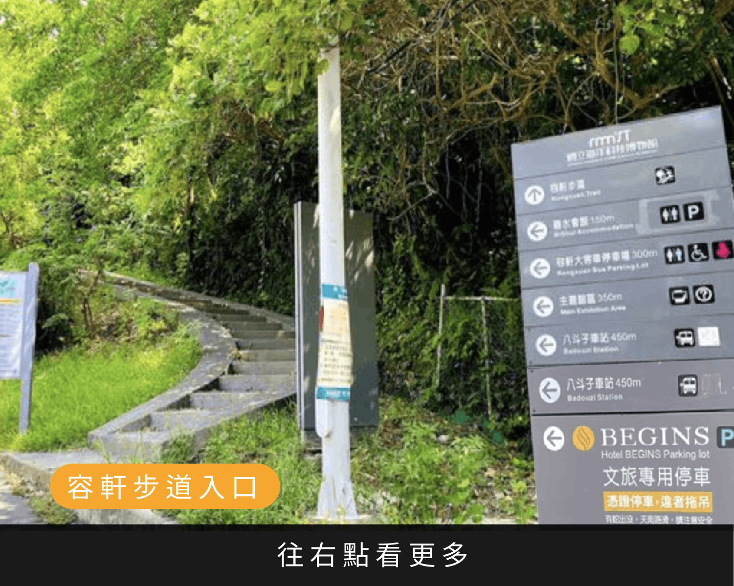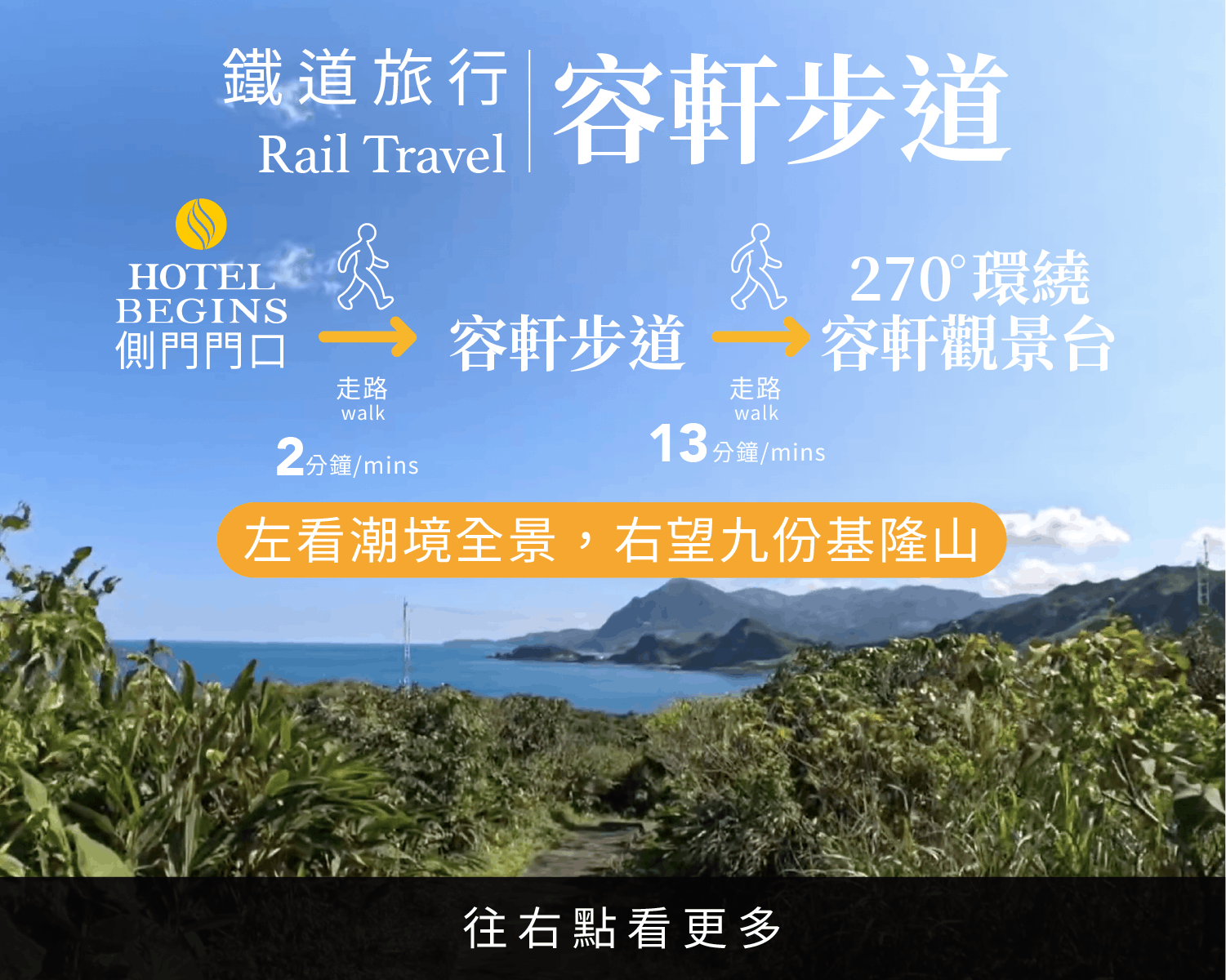 容軒步道入口走到景觀台,海拔約差 30 公尺,步道都已經餔設完備,並沒有很陡的石階,而且每往上走一小段,就會途經一個比較緩的空地,軒步道景觀台有 360 度視野,轉一圈北邊看八斗子101高地、東邊看望海巷海灣、南邊天氣好可以看到五分山氣象雷達站、西邊可以看到八斗子漁港。