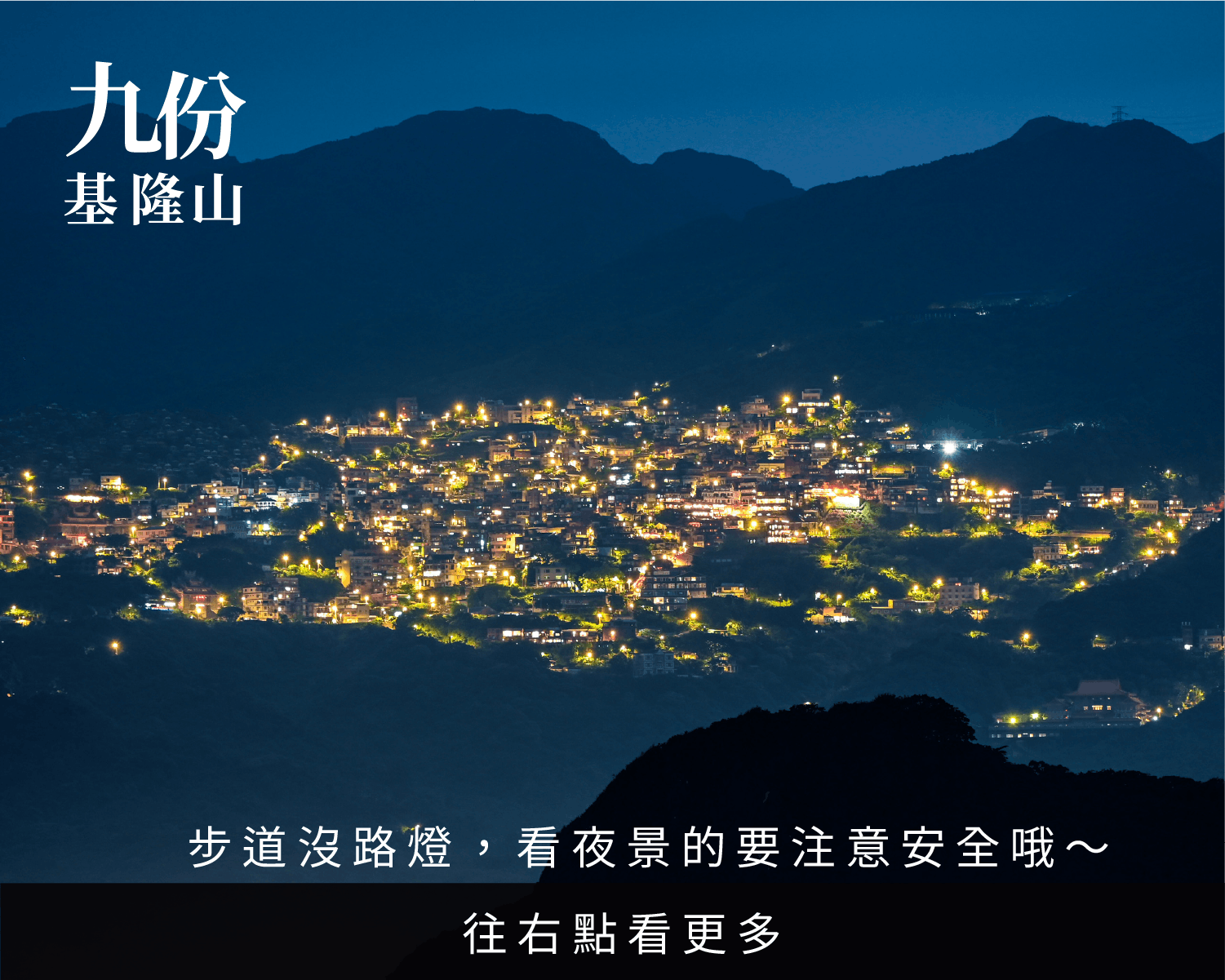 位於新北市瑞芳區,九份在金礦業興盛前,以採樟煮腦為業。此處計有九十口樟腦灶,而十口灶為一份,故共有九份,久而久之演變為九份地名。九份之發展過程可謂一段先民採金史,隨採金人潮的湧入而繁華,又隨採金事業的沒落而褪色。春夏秋冬晴雨晨昏日夜景致各具特色。區內任何面海窗戶、陽臺、門口埕等地,均可欣賞到不同季節、相異時段的自然景觀、青鬱尖聳的「雞籠山」與開闊碧藍的港灣海濱。冬日霪雨連綿,細雨中石階兀自流著瀑布般的水流,寒意襲人的繚繞霧氣,為九份增添幾許若隱若現的另一種冷清、蕭瑟面貌。白天若無雲霧瀰漫,海上一片清朗蔚藍,可遠眺層層的海浪;入夜後,海面上漁火點點,更襯托出山城夜晚的寧靜。