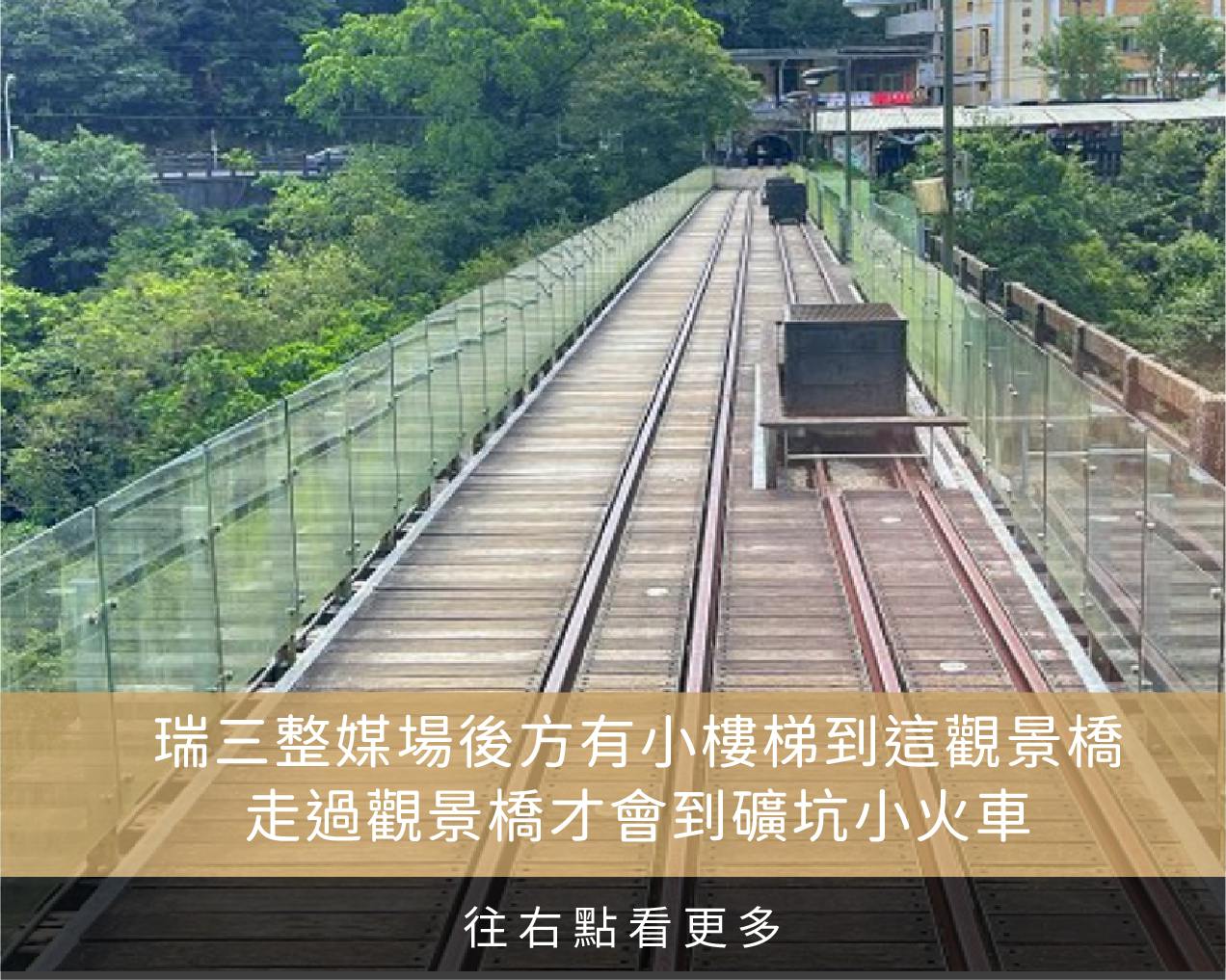 猴硐火車站,就在貓橋上了~貓橋出口一邊是往瑞三鑛業整煤廠、礦坑小火車,另一邊是往貓村。瑞三整媒場旁, 有一個不起眼的階梯, 可以由建築旁的階梯步行而上 就是最美的景觀橋(運煤橋) 走到基隆河對岸 對面是猴硐礦坑休閒園區 可以小搭礦車